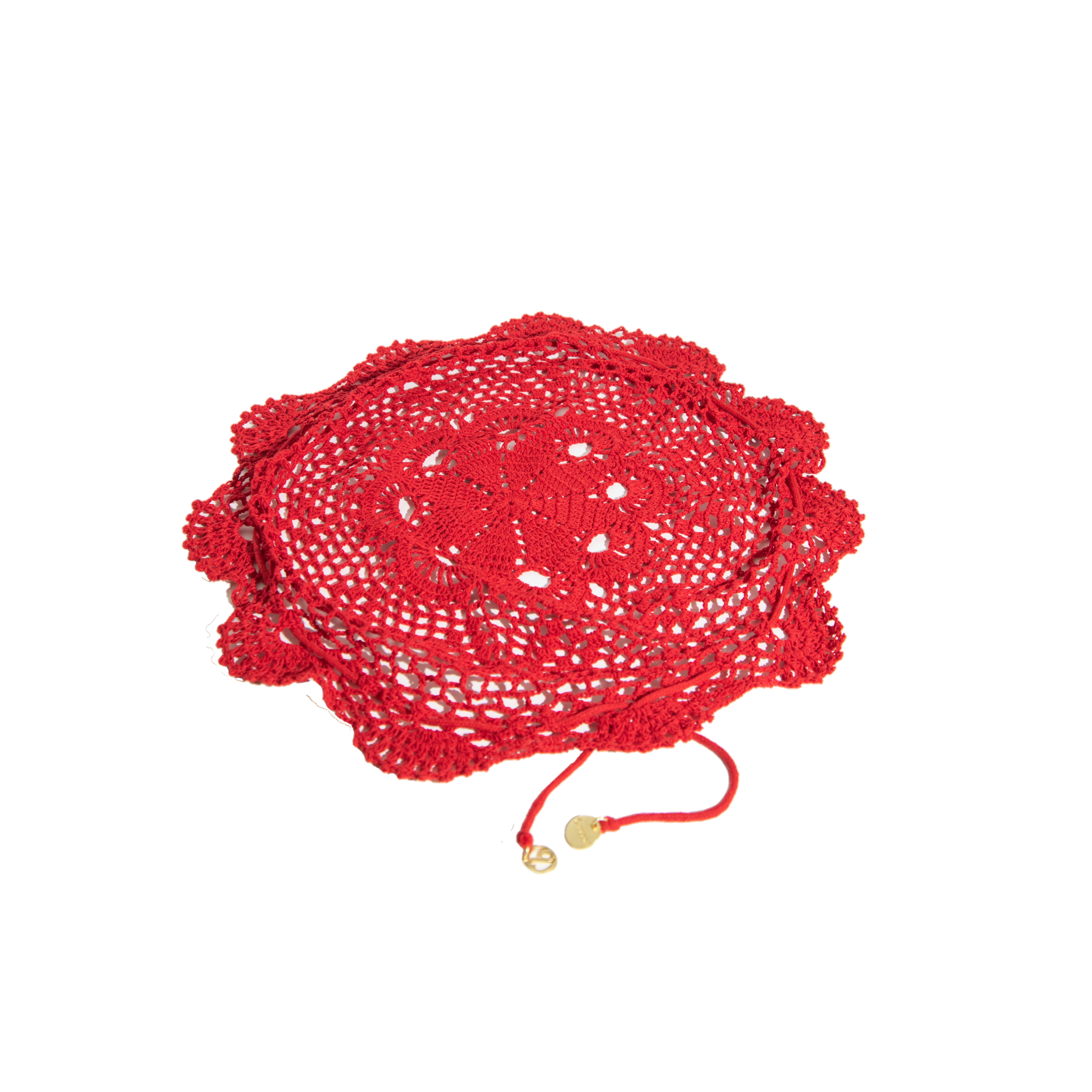 The doily shape starts as a flat flower that cocoons your belongings as the drawstring ties are pulled together. Each bag is finished with golden medallion accents, making it as beautiful on your vanity as it is tucked inside your travel tote or worn as a clutch. Also makes a beautiful sustainable gift wrap for the season of giving.